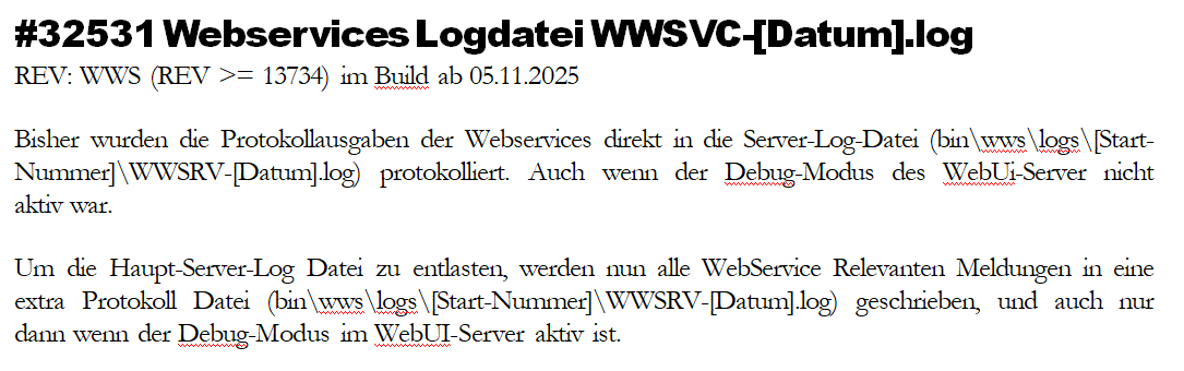 Bisher hat der WebUi-Server die Protkoll-Ausgaben der WebServices in die Haupt-Server Log Datei (bin\wws\logs\[Start-Nummer]\WWSRV-[Datum].log) protokolliert, auch bei abgeschaltetem Debug-Modus.