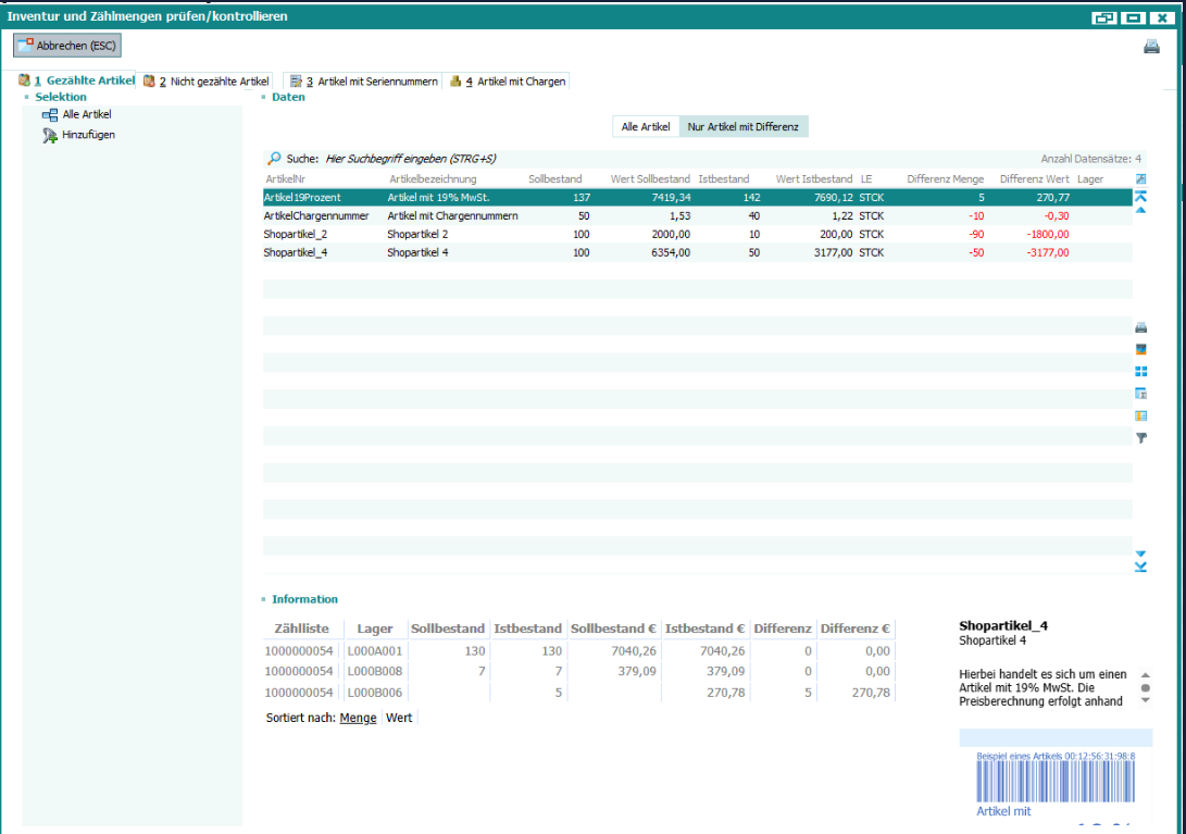 Der Anwender hat allerdings nach Verbuchung der Zähllisten keine Möglichkeit mehr, gesammelt seine Inventurdifferenzen zu prüfen/einsehen.