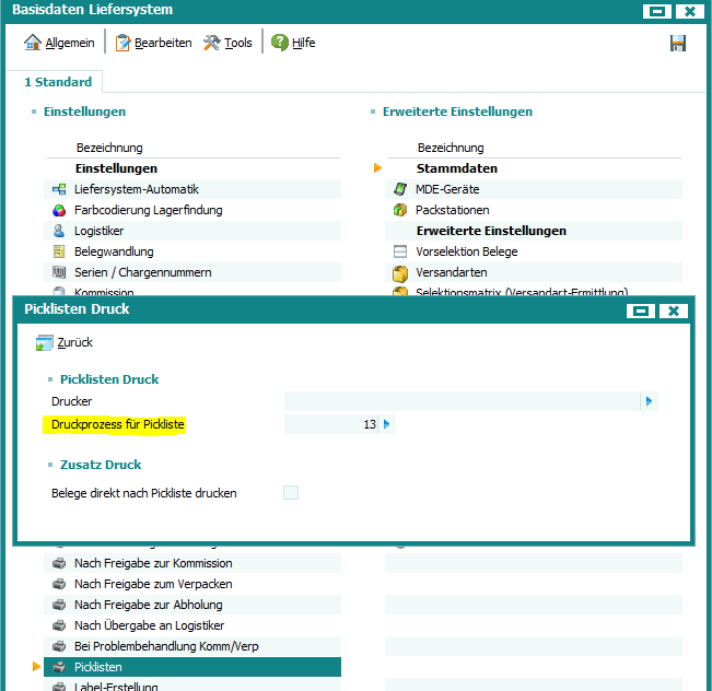 In den Basisdaten des Liefersystems kann ein Druckprozess für Picklisten hinterlegt werden.