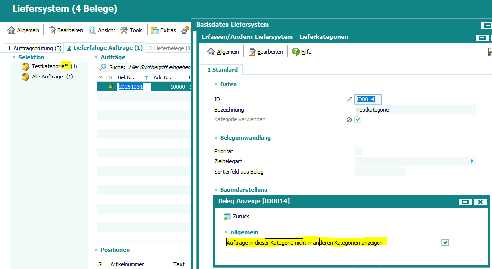 Im Liefersystem werden Aufträge auf ihre Lieferfähigkeit geprüft. Die zu prüfenden Bereiche sind als „Problemkategorien“ bezeichnet.